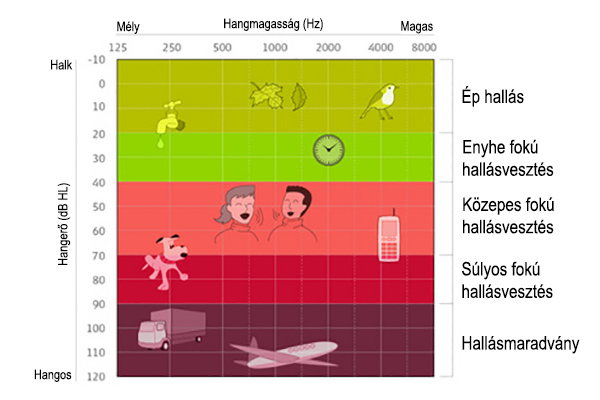 A halláscsökkenés mértékét az adja meg, hogy melyik decibelértékeken halad át a hallásgörbéd. A hivatalos felosztás szerint a következő súlyossági fokozatokat különböztetjük meg: